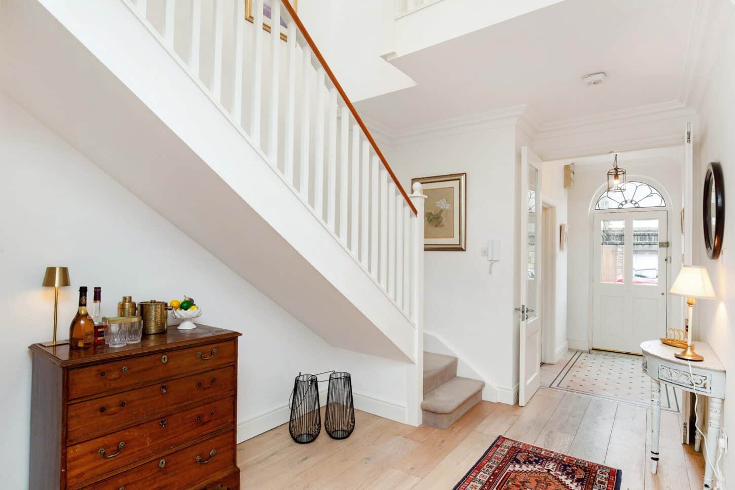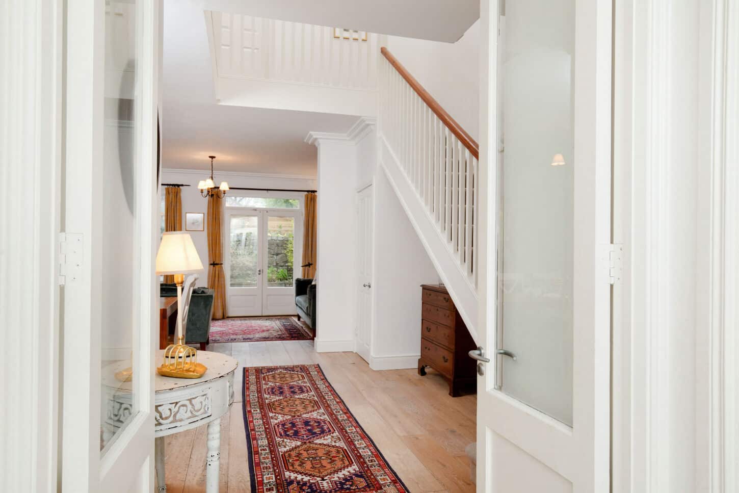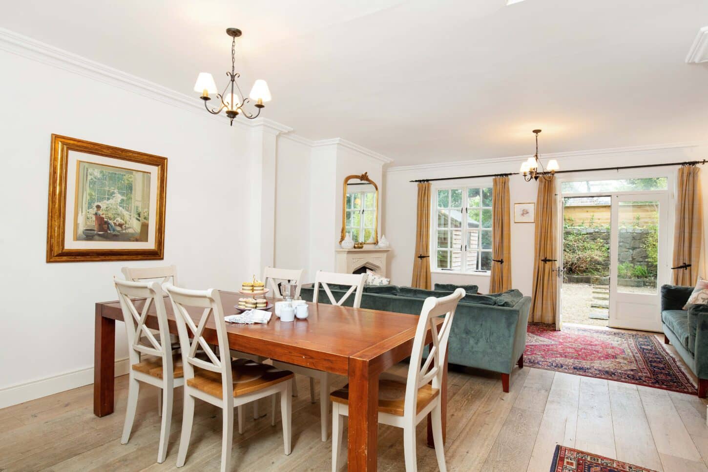 The main living area is an open plan double height room with a feature sandstone fireplace and french doors opening to the rear garden. A hardwood floor extends through from the front of the house to the rear with underfloor heating throughout the ground floor.